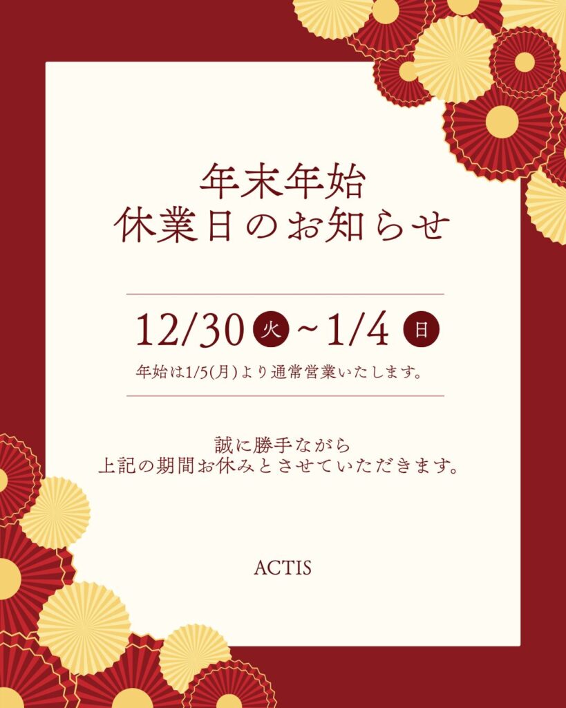 年末年始休業 2025年12月30日(火)~2026年1月4日(日)まで